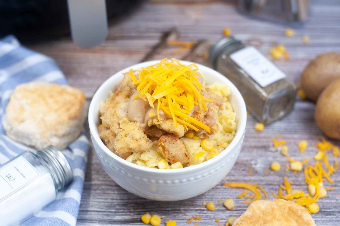 - In another mixing bowl, add the remaining corn-starch, flour, and spices.